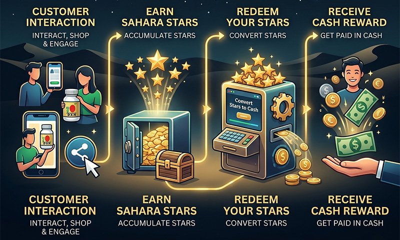 हमारी लॉयल्टी प्रोग्राम हमारे ग्राहकों के लिए डिज़ाइन की गई है जहाँ वे “सितारे”नूजम सहारा की वेबसाइट के माध्यम से की गई खरीदारी और गतिविधियों पर। ये सितारे मुफ़्त डिलीवरी, या मुफ़्त उत्पादों, या अतिरिक्त आय के लिए भुनाया जा सकता है, साथ ही जन्मदिन के पुरस्कार और विशेष ऑफ़र जैसे अन्य लाभ भी।.